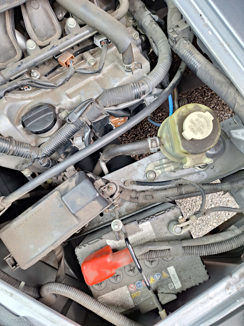 ※青丸部分のナット(12mm)を外し、パワステオイルタンクをずらすと作業しやすいです。