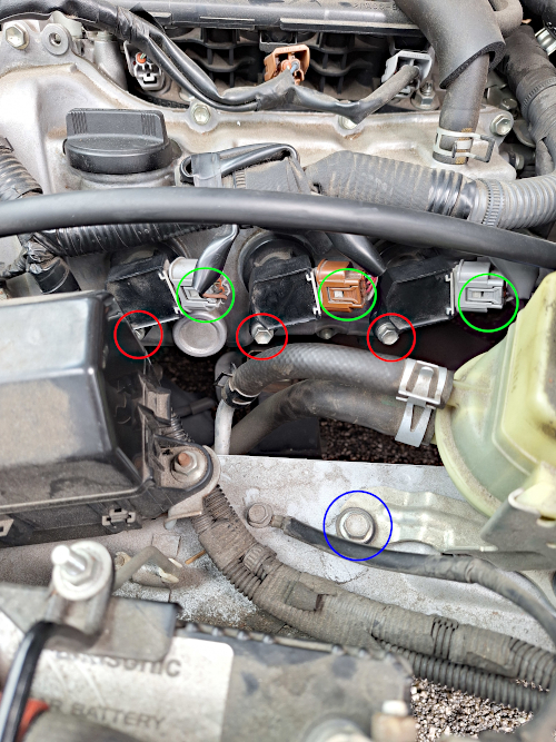 2.赤丸部分のナット(10mm)を外し、ダイレクトイグニッションコイル(黒いパーツ)を引き抜く。