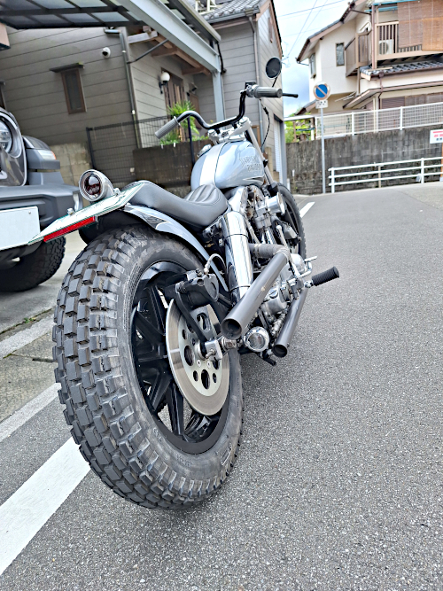 そのままダートトラックや千里浜サンドフラッツに参加できそうな、クラシカルなブロックタイヤです。